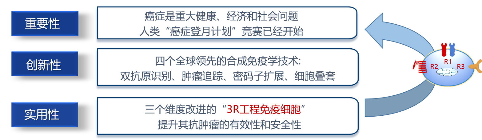 研究目标:本项目拟发展合成免疫学新理论和新方法对工程免疫细胞进行多方位的智能化改造,为免疫治疗领域带来一类特异、高效、安全的抗癌人工细胞产品,为根治实体瘤提供有力的理论和技术支撑。