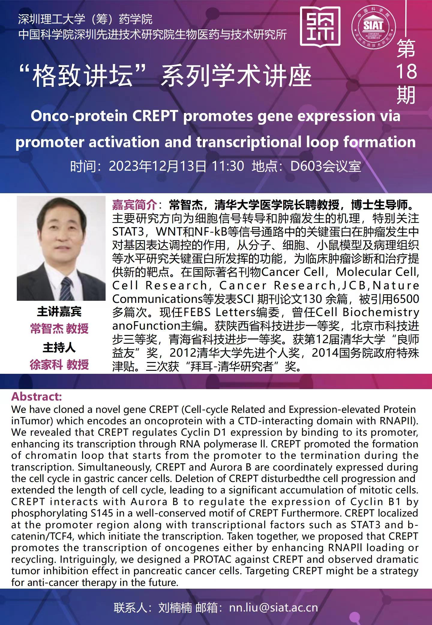 12月13日,由深圳理工大学(筹)药学院与中国科学院深圳先进技术研究院生物医药与技术研究所主办的“格致讲坛”系列学术讲座第十八期在中国科学院深圳先进技术研究院举行。清华大学医学院长聘教授常智杰受邀担任讲座主讲嘉宾,讲座由药学院徐家科教授主持。